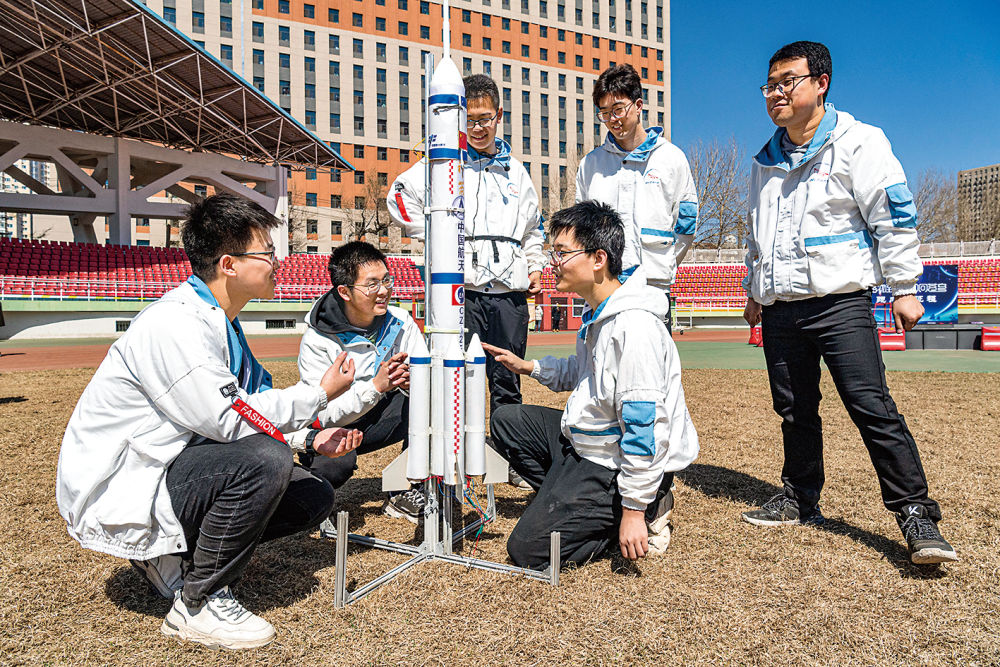 在哈尔滨工业大学体育场,航模协会的学生在航模点火发射前进行讨论。新华社资料片