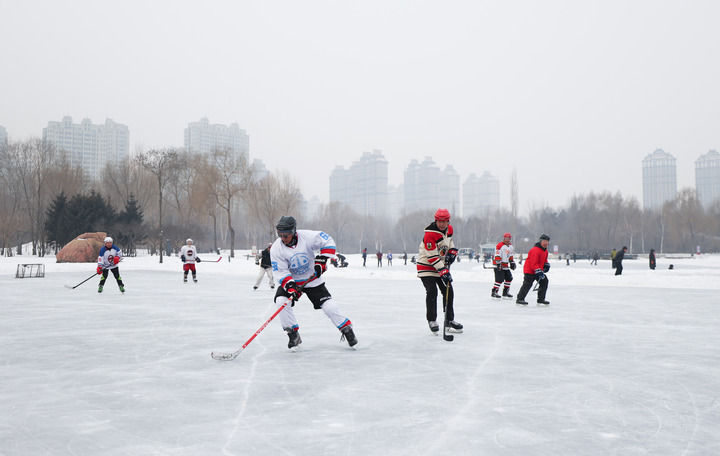 2025年1月7日,道里区老年冰球队球员在哈尔滨丁香公园内打冰球。新华社记者 许雅楠 摄
