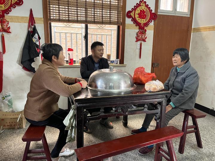 2026年2月,湖州市南浔区千金镇石桥村党总支书记、村委会主任宋根荣(中)与村民在家中交流。受访者供图