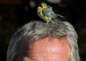 | 小鸟误将英国男子头发当鸟窝 |