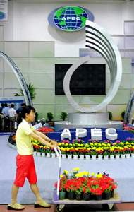 第二届亚太经合组织投资博览会将于6月9日至15日在山东烟台举行,目前,各项准备工作已基本就绪。图为工作人员正在用鲜花装饰博览会主展馆。 新华社记者 范长国摄