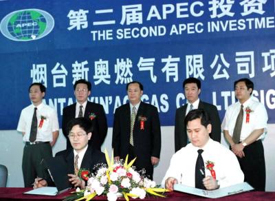 在烟台举行的第二届APEC投资博览会为中外客商提供无限商机。截止12日,博览会共达成51个签约项目,签约资金突破4亿美元。图为英国新奥特燃料投资集团公司与烟台经济技术开发区投资促进局签约300万美元的燃气投资项目。 新华社记者范长国摄