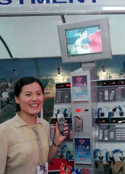 在烟台举行的第二届APEC投资博览会上,科技新产品格外引人注目。这位小姐在展示一台能上网同时又能为12只不同型号的手机充电的多功能手机充电站。新华社记者范长国摄