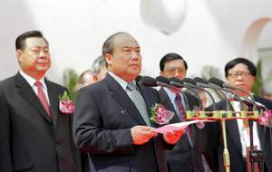 6月9日,第二届亚太经合组织(APEC)投资博览会在烟台开幕。来自亚太经合组织21个成员经济体的代表团参加此次为期六天的博览会。图为中国外经贸部部长石广生出席开幕式并讲话。 新华社记者 范长国摄