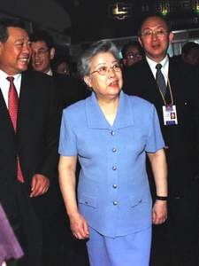 6月9日,第二届亚太经合组织(APEC)投资博览会在烟台开幕。来自亚太经合组织21个成员经济体的代表团参加此次为期六天的博览会。图为前来出席开幕式的国务委员吴仪在开幕式前参观展馆。