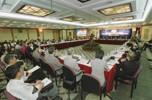 5月18日,由南开大学APEC研究中心主办的2001年APEC研究中心联席会议在天津经济技术开发区举行。这次会议的主题是“走进新世纪的APEC”。会议将就“APEC能力建设和经济技术合作的发展”、“APEC迎接全球化和新经济的挑战”、“次区域贸易安排与APEC”、“多边贸易体制与APEC”等问题展开讨论。图为会议会场。 新华社记者刘海峰摄