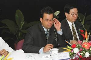 5月18日,由南开大学APEC研究中心主办的2001年APEC研究中心联席会议在天津经济技术开发区举行。这次会议的主题是“走进新世纪的APEC”,会议将就“APEC能力建设和经济技术合作的发展”、“APEC迎接全球化和新经济的挑战”、“次区域贸易安排与APEC”、“多边贸易体制与APEC”等问题展开讨论。图为APEC秘书处代表马里奥·阿塔萨先生在会议上发言。新华社记者刘海峰摄