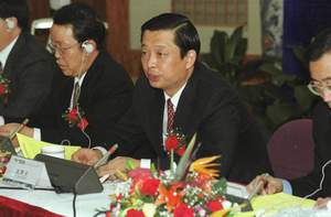 5月18日,2001年APEC研究中心联席会议在天津经济技术开发区举行。这次会议的主题是“走进新世纪的APEC”,会议将就“APEC能力建设和经济技术合作的发展”、“APEC迎接全球化和新经济的挑战”、“次区域贸易安排与APEC”、“多边贸易体制与APEC”等问题展开讨论。图为天津市滨海新区主任皮黔生在会议上发言。新华社记者刘海峰摄