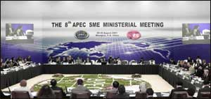 8月29日,第八届亚太经合组织中小企业部长会议在上海国际会议中心开幕。APEC21个成员体负责中小企业事务的部长和代表及参加会议的代表团成员等参加会议。图为大会会场。 新华社记者 张明摄