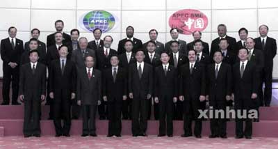 8月28日,国务院副总理吴邦国在上海国际会议中心会见了参加第八届APEC中小企业部长会议的各成员体代表团团长。中共中央政治局委员、上海市委书记黄菊参加了会见。 图为吴邦国副总理同参加第八届APEC中小企业部长会议的各成员体代表团团长合影留念。 新华社记者 张明摄