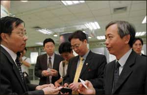 8月30日,参加APEC中小企业工商论坛的代表参观上海市小企业生产力促进服务中心。图为香港职业训练局首席顾问邢宏彬(右一)与该中心主任梅建政(左一)探讨进行两地职业培训交流的可能性。 新华社记者任珑摄