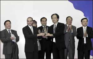 8月30日,第八届亚太经合组织中小企业部长会议在上海闭幕。图为中国代表团一名成员(右三)将一个象征一帆风顺的纪念品交给下届会议主办国墨西哥代表团代表(左二)。 新华社记者 张明 摄