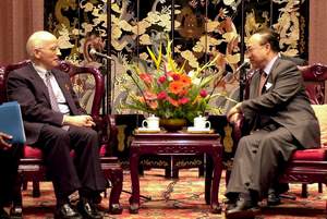 9月7日,中国财政部长项怀诚在苏州会见前来参加第八届亚太经合组织财长会议的世界银行常务副行长斯文·桑德斯特伦(左)。第八届亚太经合组织财长会议将于9月8日至9日在苏州举行。新华社记者徐澎摄