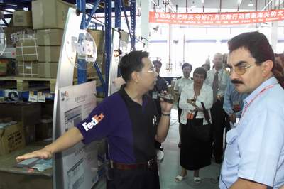 8月14日,在上海参加亚太经合组织海关与商界对话会的代表来到上海浦东国际机场上海海关参观。这是与会代表在浦东机场美国联邦快递公司参观。新华社记者 张明摄
