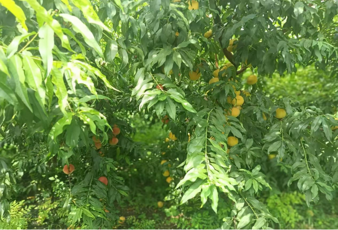 立秋刚过,一场雨水暂时抵消了阳光的炙烤,带着丝丝凉意的桃林显得格外清新。走进山东省鄄城县旧城镇特润果品的黄桃种植基地,一幅热火朝天的丰收景象扑面而来。桃林中,一个个色泽金黄、个大饱满的黄桃挂满枝头,在郁郁葱葱的枝叶间若隐若现。正值黄桃的采摘期,工人们正忙碌地采摘、分拣、装箱、运输,空气中弥漫着浓郁清甜的桃香,令人陶醉其中。
