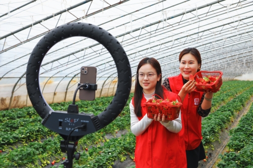 图为“金叶阳光”志愿者在草莓大棚里直播助农