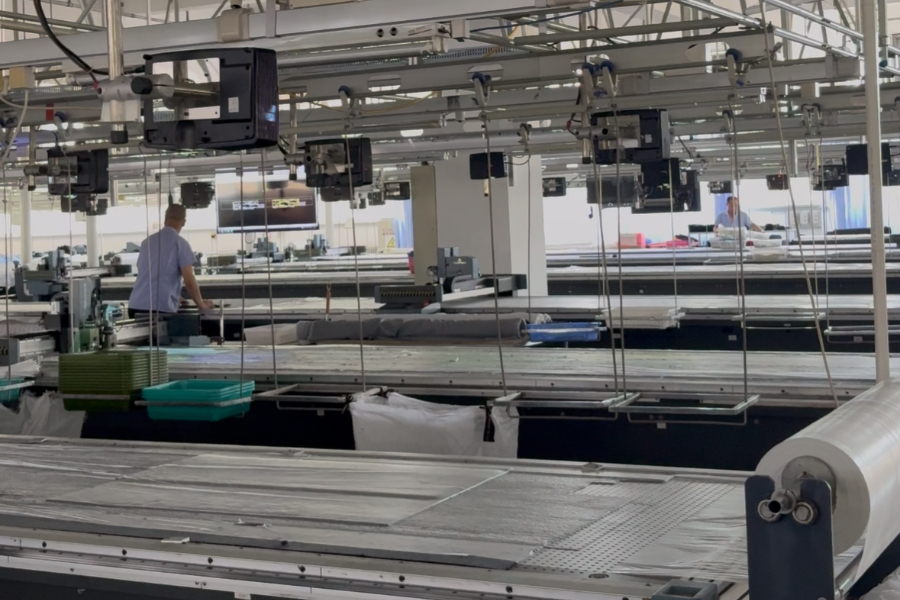 裁剪环节是定制服装“个性化”的第一道关卡,贸大时装引入国际领先的智能裁剪生产线,以3D投影技术与CAD版型数据处理系统形成“技术组合拳”。传统定制裁剪需人工根据订单尺寸单独排版,既浪费面料又易出现误差,而该生产线接收订单信息后,可自动将版型数据转化为精准裁剪图形,同时智能优化面料排版——不仅解决网格面料方向性、匹配性的行业难题,更实现用料成本大幅缩减,单裁产品裁剪效率显著提升,为“一衣一款”的规模化生产奠定基础。