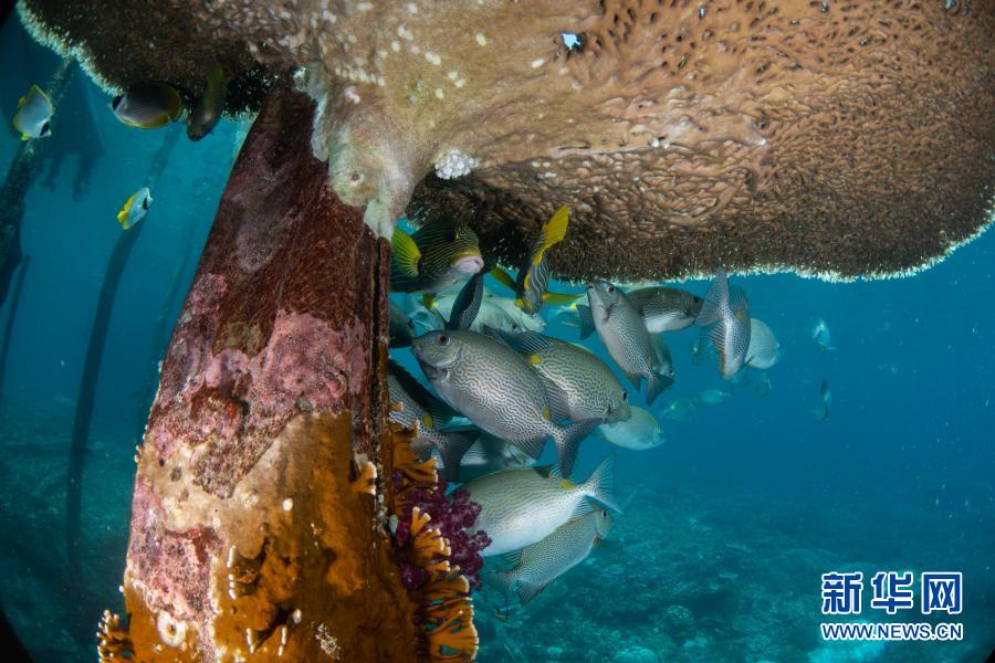 这是2020年12月21日在印度尼西亚四王群岛海域拍摄的一群藏在珊瑚下边的鱼。四王群岛位于印度尼西亚西巴布亚省新几内亚岛的西缘,由1500多个大小岛屿组成。根据世界自然基金会公布的数据,四王群岛海域拥有逾600种珊瑚,约占人类已知珊瑚种类的75%。