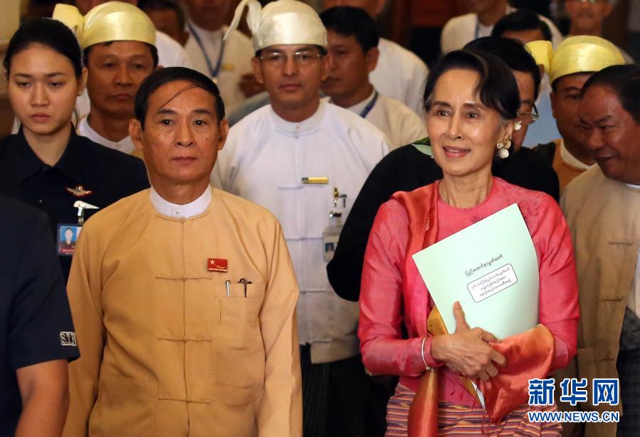 这是2018年3月28日在缅甸内比都拍摄的温敏(前左)和昂山素季(前右)的资料照片。新华社发(吴昂摄)