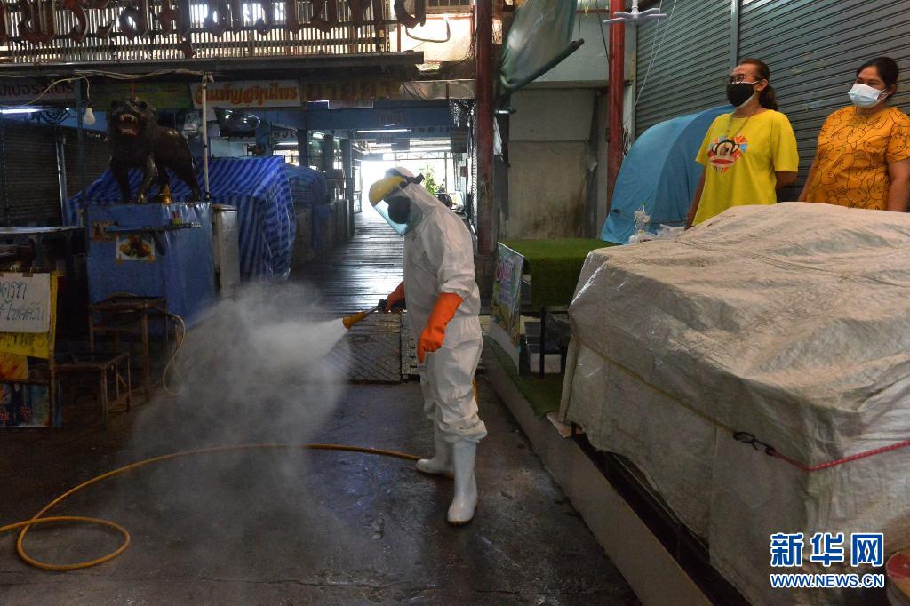 6月21日,工作人员在泰国首都曼谷一处生鲜市场进行消毒。