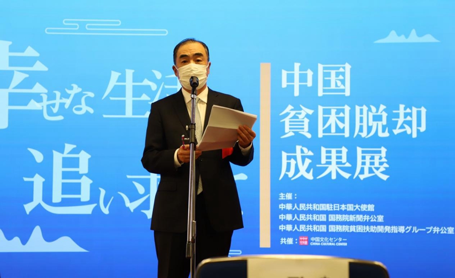 图为中国驻日本大使孔铉佑在庆祝中国共产党成立一百周年“追寻美好生活”中国脱贫成就展开幕式上致辞。新华社记者 郭丹 摄
