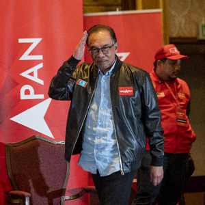 11月20日,在马来西亚雪兰莪州的梳邦再也,希望联盟领袖安瓦尔(前)出席新闻发布会。新华社发(张纹综摄)