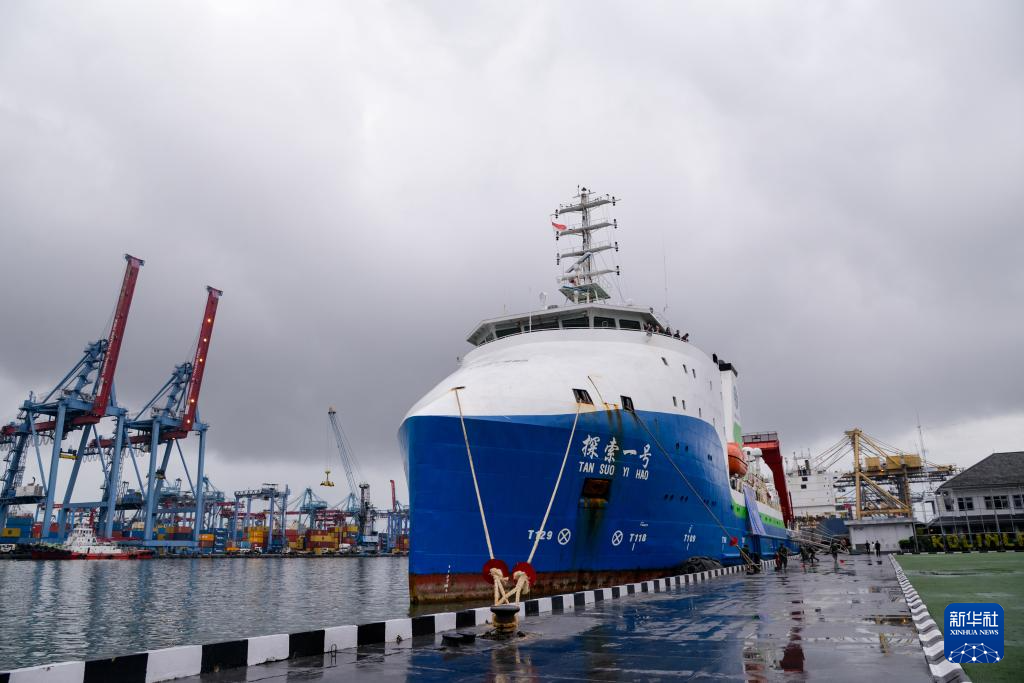 这是3月22日在印度尼西亚雅加达拍摄的停靠在丹戎不碌港的“探索一号”科考船。新华社记者 徐钦 摄