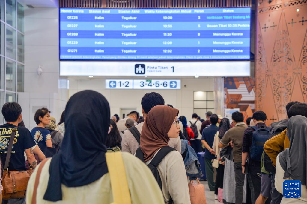 4月17日,在印度尼西亚雅加达哈利姆站候车大厅,乘客排队准备前往站台。