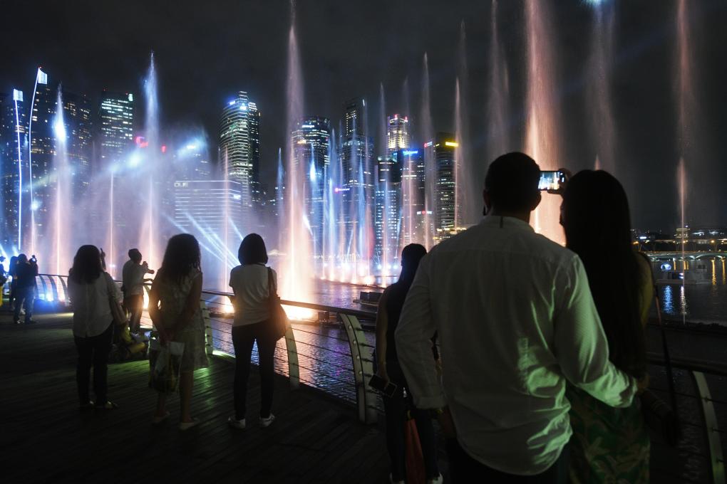 2022年4月28日,游客在新加坡滨海湾金沙观赏一场灯光喷泉秀。新华社发(邓智炜摄)