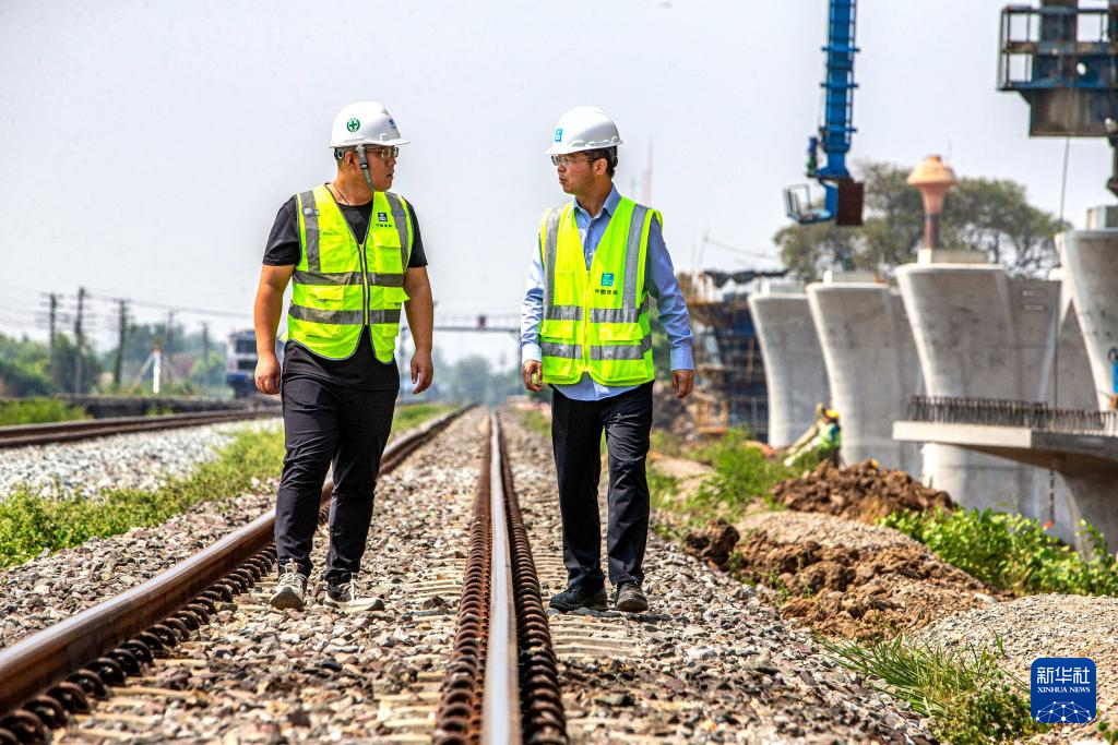 5月1日,在泰国大城府,中泰高铁项目工作人员在施工现场勘查。