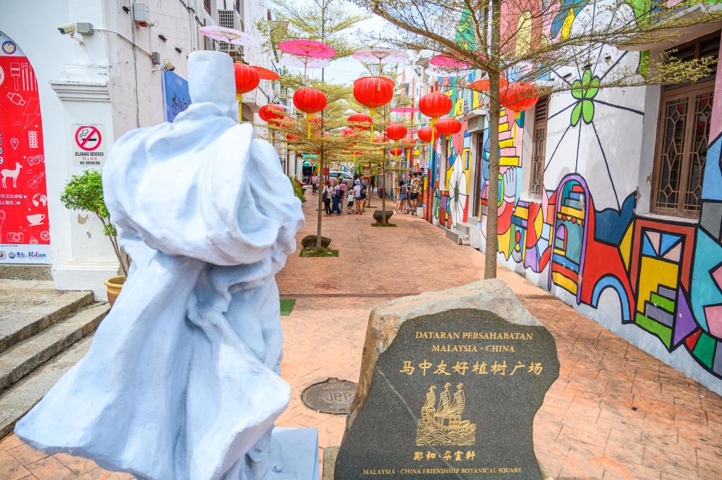 这是2019年12月20日在马来西亚马六甲拍摄的郑和·朵云轩(马六甲)艺术馆外的马中友好植树广场。600多年前,郑和五次驻节马六甲,由他带到这片土地上的中华文化如今已深深融入当地多元文化之中。新华社记者朱炜摄