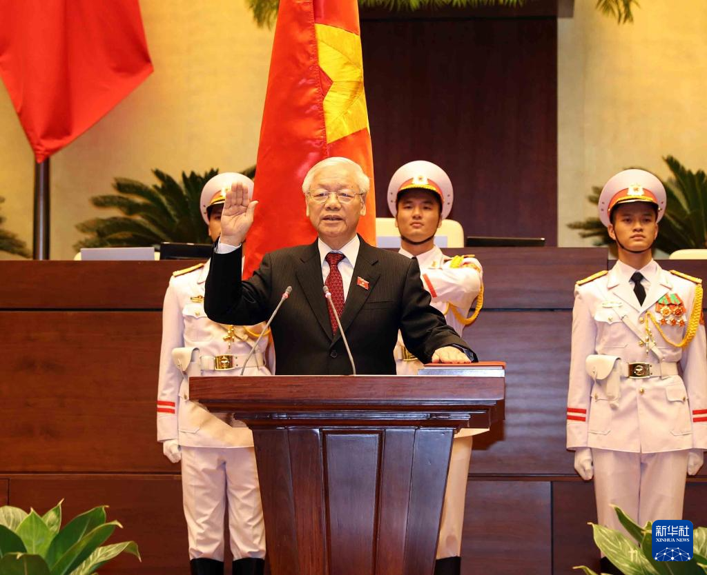 这是2018年10月23日,在越南首都河内,阮富仲(前)当选新一任越南国家主席后宣誓就职的资料照片。