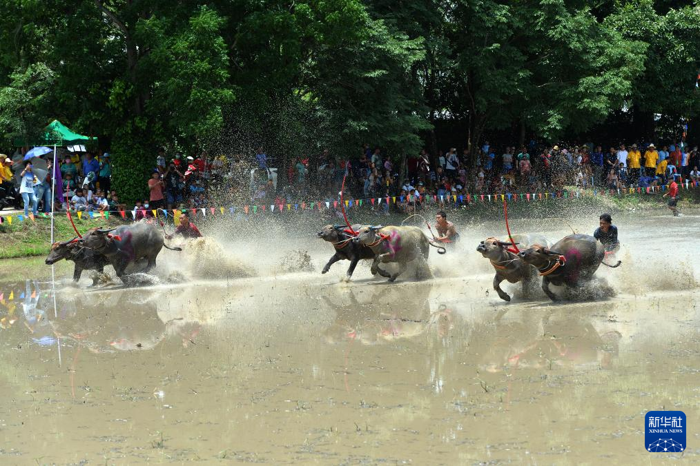 8月4日,参赛者在泰国春武里府驾驭水牛参加比赛。