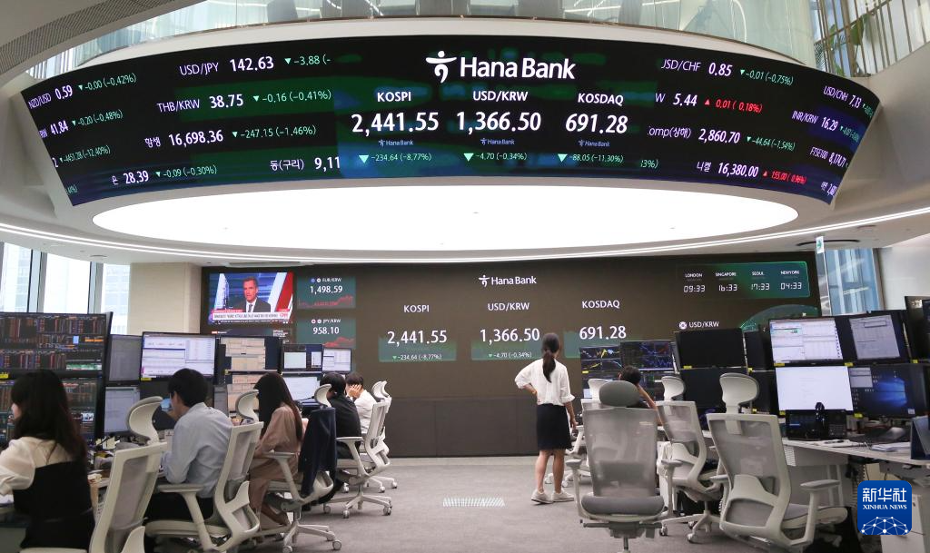 8月5日,工作人员在韩国首尔韩亚银行的股指信息屏幕前工作。