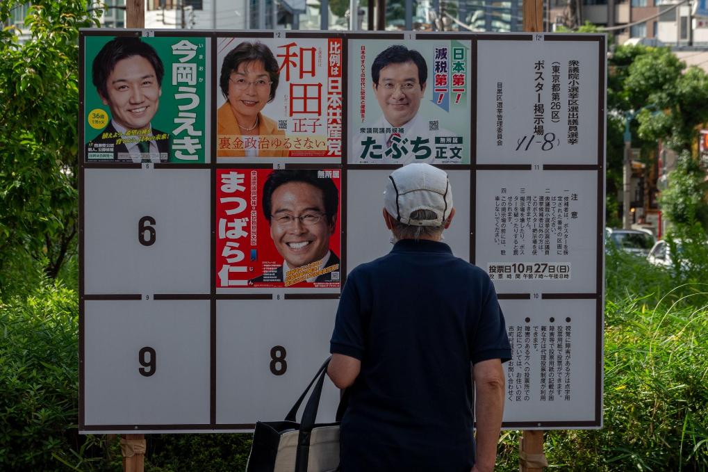 10月15日,一位行人在观看日本东京的一处众议院议员选举公示板。新华社记者张笑宇摄