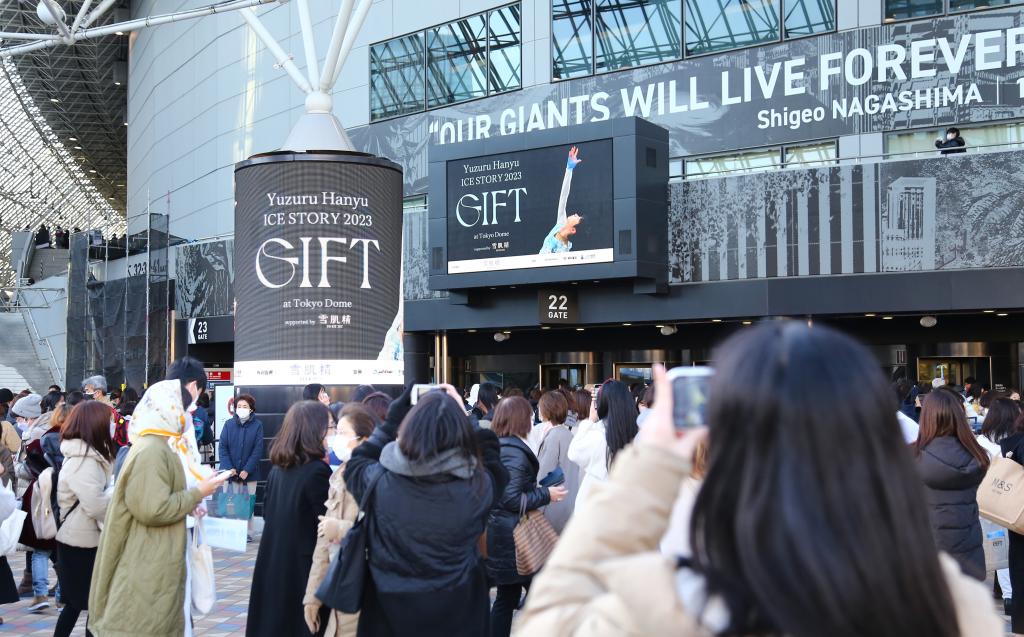 2023年2月26日,观众在演出前拍摄体育馆外大屏幕上的公演广告。新华社记者 钱铮 摄
