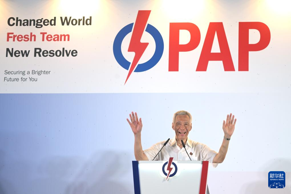 5月4日,新加坡国务资政李显龙(中)在新加坡向人民行动党支持者致谢。