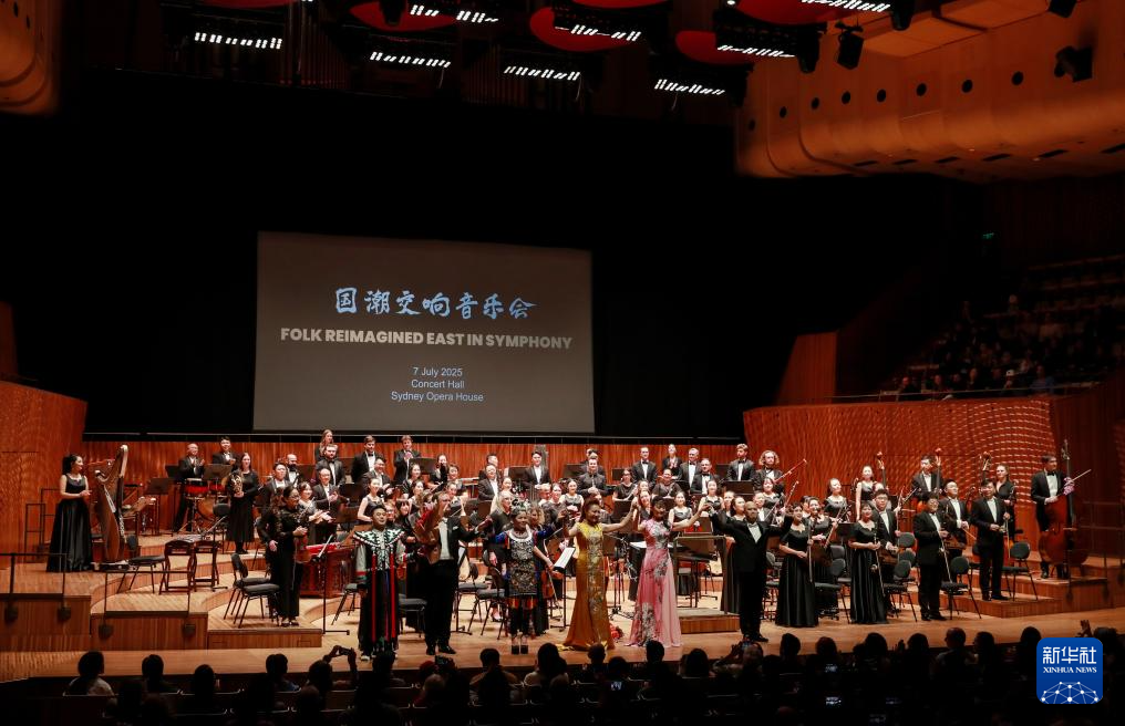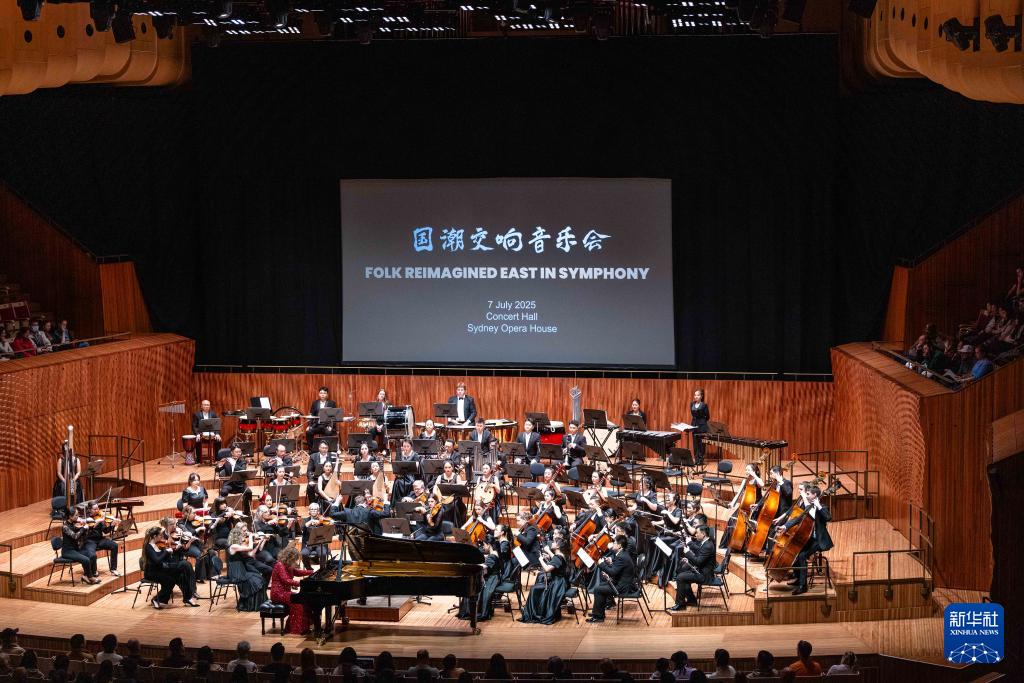 7月7日,在澳大利亚悉尼歌剧院,来自多彩贵州艺术团和澳大利亚管弦乐团的成员们在音乐会上演奏。