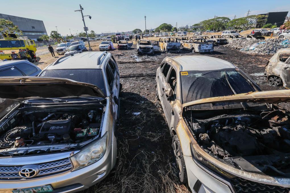 这是2024年4月22日在菲律宾尼诺伊·阿基诺机场的一处停车场拍摄的被烧毁的车辆。新华社发(乌马利摄)