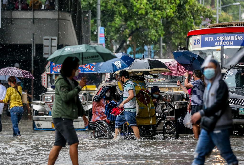 2021年7月21日,行人在菲律宾马尼拉街头的积水中前行。新华社发(乌马利摄)