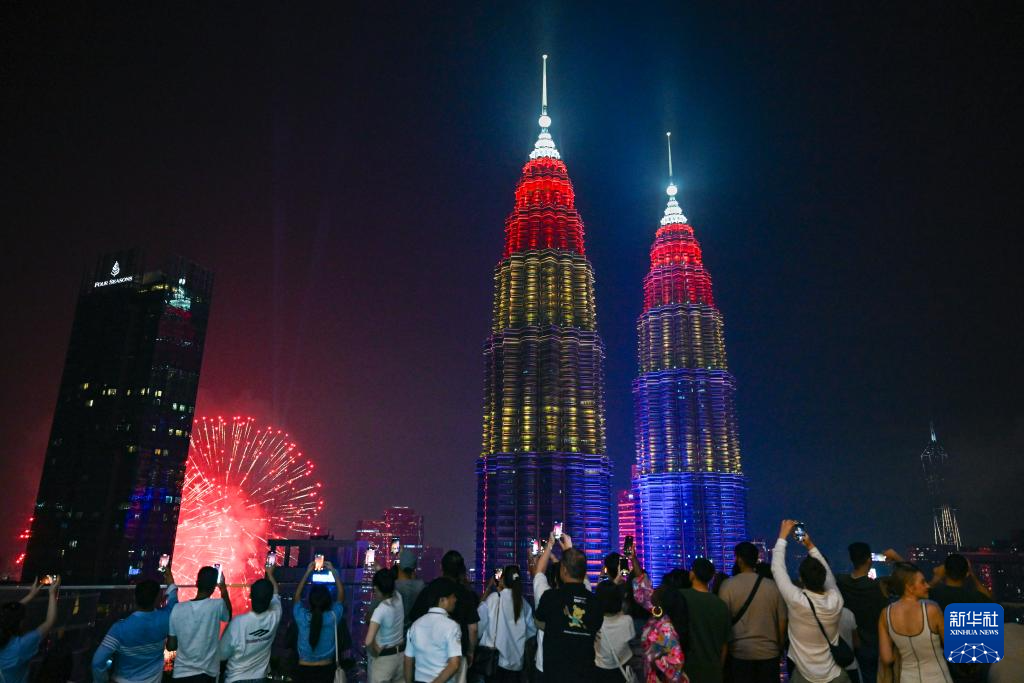 8月31日,在马来西亚吉隆坡,人们在马来西亚国家石油公司双塔附近观看焰火表演。