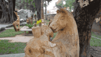 展览中的木雕马出自越南西原地区的工匠,他们以手掌和臂展为尺,借助简单的工具让形状独特的木块变身艺术作品。