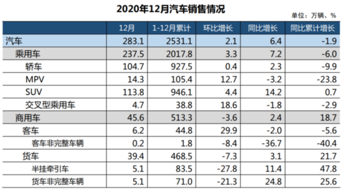 2020年12月,汽车产销形势总体保持稳定,产量环比略有下降,销量小幅增长,同比继续保持增长。12月,汽车产销分别达到284.0万辆和283.1万辆,产量环比下降0.3%,销量增长2.1%,同比增长5.7%和6.4%,增速比上月有所减缓。