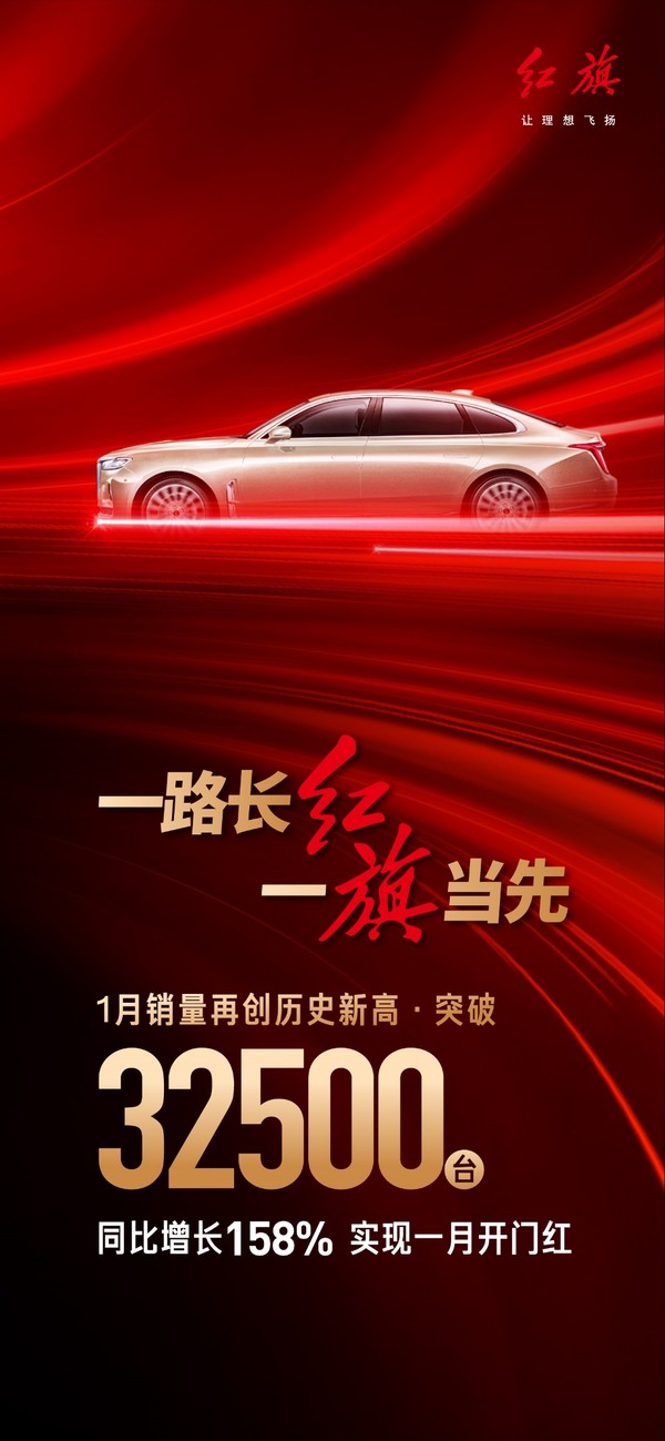 山有红旗知劲旅,星光不问赶路人。在全球经济重创的大气候下,2020年红旗品牌依然达成年度20万销量目标。2021年1月,红旗品牌以月销突破32500台的成绩,迈入月销3万辆俱乐部,实现单月销量再次突破;同比增长高达158%,在整体乘用车市场中独树一帜,再次实现历史性跨越;尤其是在各地疫情又出现反弹并加大疫情防控力度的背景下,取得这样的成绩实属难得。这背后,凝聚的是红旗人的智慧和汗水,折射的是红旗品牌的细致、温暖和活力。这不仅是对“双循环”的鲜明注脚,也是红旗品牌唱响销量C位进行曲,迈出“十四五”开局之年坚实的第一步。