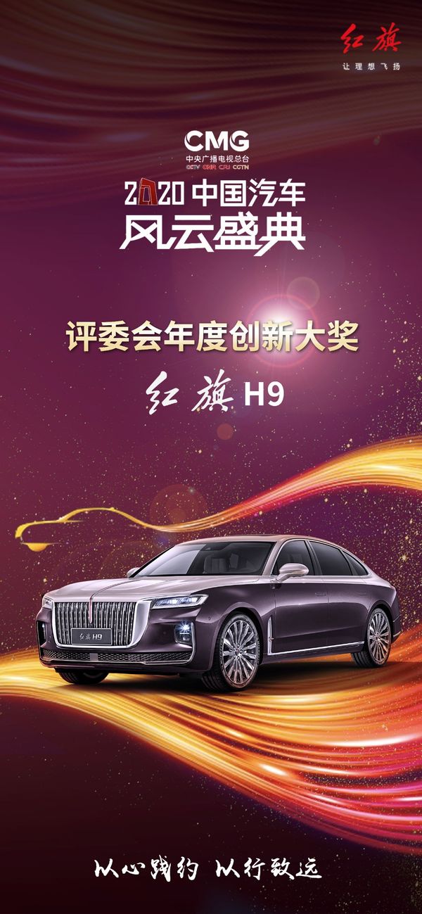 在全体红旗人的努力下,红旗品牌受到了媒体和用户一致好评。在央视主办的《2020中国汽车风云盛典》中,红旗H9力拔头筹,荣获“评委会年度创新大奖”;而在第十七届胡润至尚优品颁奖典礼上,红旗E-HS9以其独特的东方魅力和领先的智造水准,赢得豪华大型纯电SUV最佳表现奖。连续两个重量级大奖,是市场对红旗最真实的反馈。