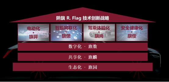 技术发展战略由“电动化 · 旗羿、智能网联化 ∙ 旗偲、驾乘体验化 ∙ 旗尚、安全健康化 ∙ 旗侒、数字化 ∙ 旗数、共享化 ∙ 旗麟、生态化 ∙ 旗园”构成。