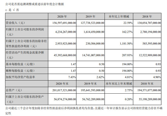 比亚迪方面(A股:002594;H股:01211),2020年营业收入为1565.97亿元,同比增长22.59%;归母净利润42.34亿元,同比大幅增加162.27%;扣非归母净利润29.54 亿元,同比涨幅达1181.5%。