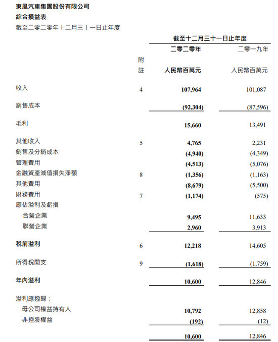 随着营收的上升,集团的毛利总额也有所增加,2020年东风汽车集团毛利总额为156.60亿元,同比增加16.1%;综合毛利率为14.5%,同比增加1.2%;归母净利润依然下降。财报显示,受新冠疫情影响,东风汽车集团股东应占溢利损失达38亿元以上,导致该项数据同比下降16.1%至107.92亿元。