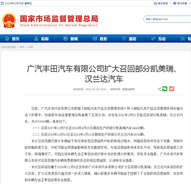 新华网1月29日电 据国家市场监督管理总局消息,日前,广汽丰田汽车有限公司根据《缺陷汽车产品召回管理条例》和《缺陷汽车产品召回管理条例实施办法》的要求,向国家市场监督管理总局备案了召回计划。决定自2021年3月31日起召回部分凯美瑞、汉兰达汽车,共计53000辆。