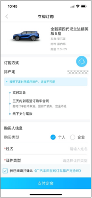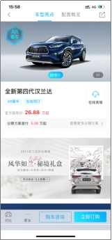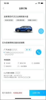 线上下订-便捷:用户登录丰云行App,点击“立即购车”进入页面,选择全新第四代汉兰达车型版本、车身色和内饰颜色;查看各地经销店可售车辆数量以及预计生产日期,选择经销商,即可线上订购。